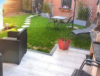 -Jardin arboré à l'avant et à l'arrière avec terrasse de 12 m² et barbecue en pierre, parfait pour des moments de détente à l'extérieur.